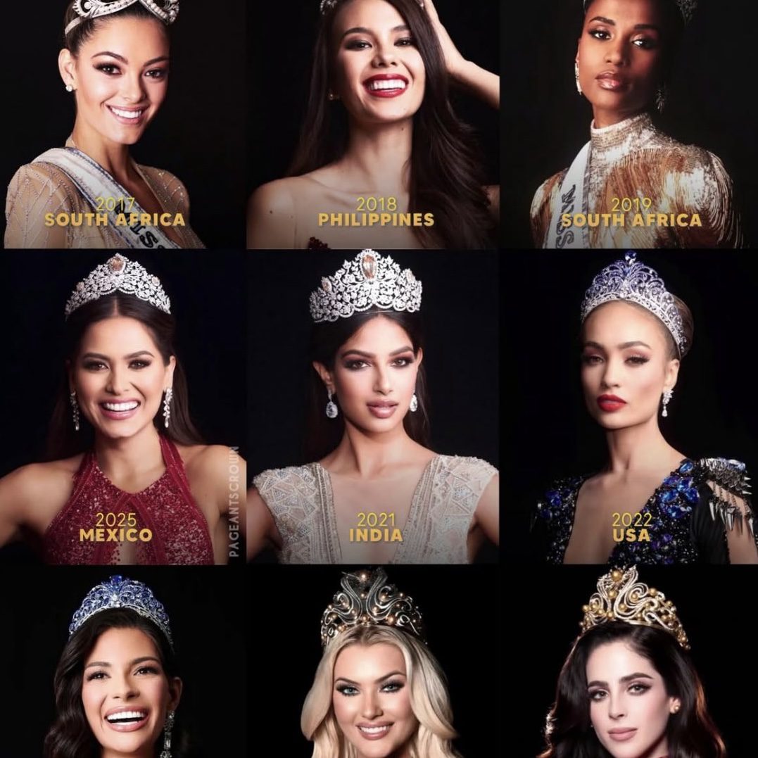 Pasando por una corona con un valor de 5 millones de dólares. Esta es de color dorado y en su estructura lleva perlas junto a diamantes incrustados. Esta en particular, está siendo usada por segunda vez por la actual Miss Universo 2025, Fátima Bosch.